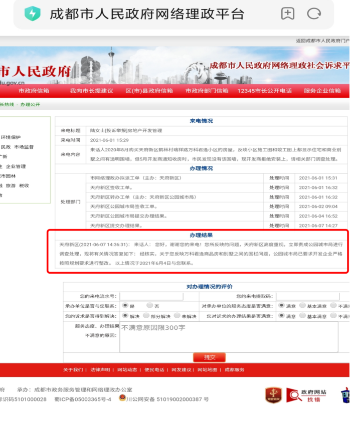 2021年,天府新区公园城市局在给维权业主答复时表示,在小区规划图纸中,商业别墅和普通住宅之间确实存在通透式围墙,规划核实与审批图纸一致。另外,该部门在2021年6月的回复还中表示,“已要求开发企业严格按照规划要求进行整改”。
