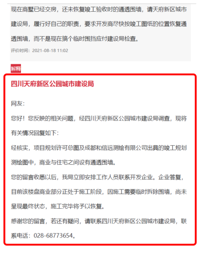 于是,经过多次网络、电话等形式的咨询和投诉,天府新区公园城市局于2021年8月回复称,企业方面对此答复为“目前该楼盘商业部分正处于施工阶段,因施工需要临时拆除围墙,尚未呈现最终状态,施工完毕将予以恢复”。