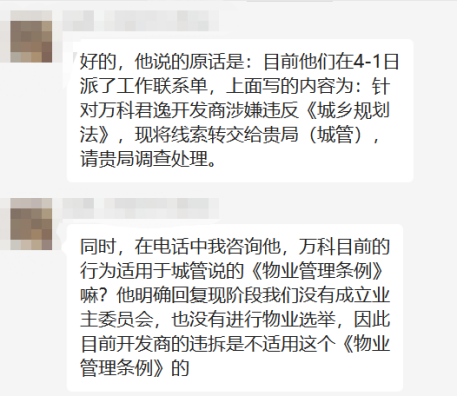 对此,成都万科对大公房产表示,万科君逸的情况公司一直在关注,此前万科已经成立了专项工作小组,也正在与业主沟通和征求意见,争取尽快解决业主问题。