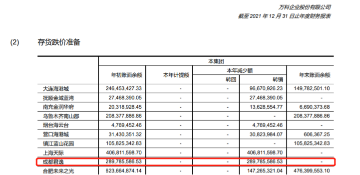 此外,大公房产还注意到,万科披露的2021年财报中显示,截至2021年12月31日,集团存货跌价准备一栏中,成都万科君逸年初账面余额约为2.9亿元,本年减少额中转销部分约为2.9亿元。