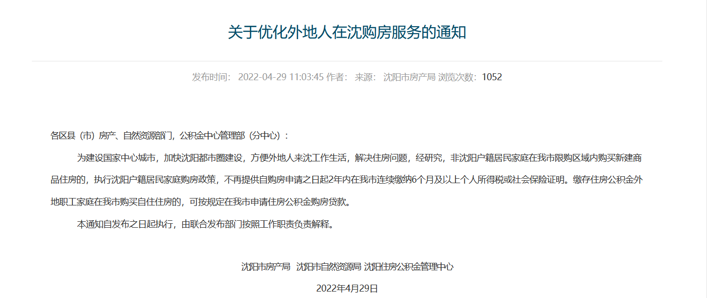 大公房产讯 4月29日,辽宁省沈阳市房产局发布《关于优化外地人在沈购房服务的通知》(简称《通知》)。