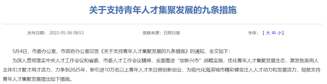 大公房产讯 据日照市人民政府官网,近日,山东省日照市政府办公室印发《关于支持青年人才集聚发展的九条措施》(下文简称《措施》)。