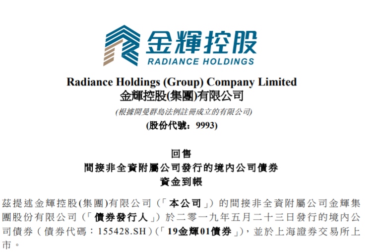 公告称,于5月18日,金辉控股间接非全资附属公司金辉集团股份有限公司已将所需资金悉数存入于中国证券登记结算有限责任公司上海分公司指定银行账户,用作于2022年5月23日“19金辉01”回售本金及利息支付工作,该债券未偿还本金额20亿元,连同利息1.36亿元。