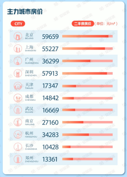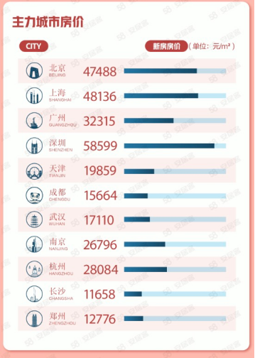 58同城、安居客《5月国民安居指数报告》显示,5月65城新房线上均价为17549元/㎡,环比上涨0.11%,全国重点65城中有26城新房房价环比上涨。一线城市中,深圳新房线上均价为58599元/㎡,上海和北京新房线上均价分别为48136元/㎡和47488元/㎡,广州新房线上均价为32315元/㎡。新一线城市中杭州和南京的新房线上均价分别为28084元/㎡、26796元/㎡。