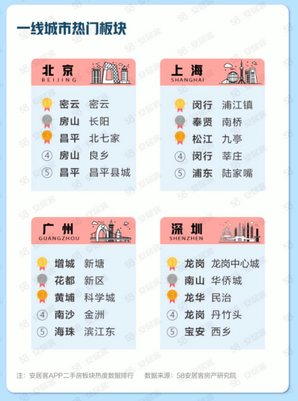 在热门板块方面,北京密云、长阳、北七家、良乡和昌平县城;上海浦江镇、南桥、九亭、莘庄和陆家嘴;广州新塘、新区、科学城、金洲和滨江东;深圳龙岗中心城、华侨城、民治、丹竹头和西乡等板块表现出较高的热度。