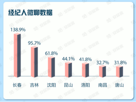 58安居客房产研究院通过对经纪人调研发现,微聊数据方面,长春、吉林、沈阳、昆山等地购房者与经纪人沟通频率较高。吉林、长春、沈阳、哈尔滨等城市经纪人解答房产问题较多。