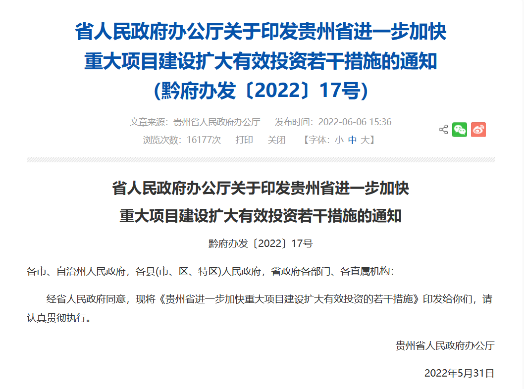 大公房产讯 据贵州省人民政府网站消息,贵州省人民政府办公厅6月6日出台《贵州省进一步加快重大项目建设扩大有效投资若干措施》(以下简称“措施”)。