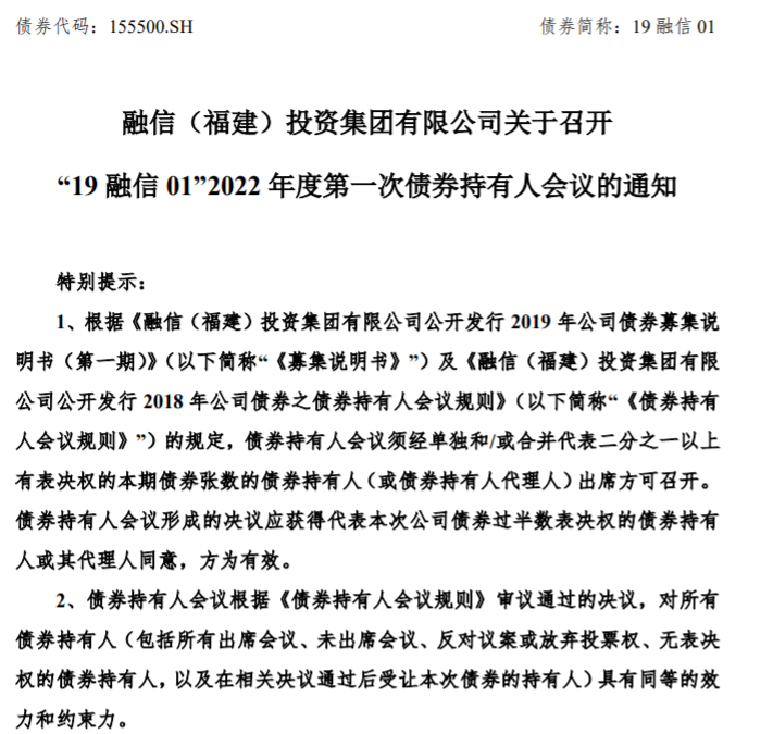 另外,公司将于7月4日召开“19融信01”2022年度第一次债券持有人会议及“19融信02”2022年度第二次债券持有人会议。