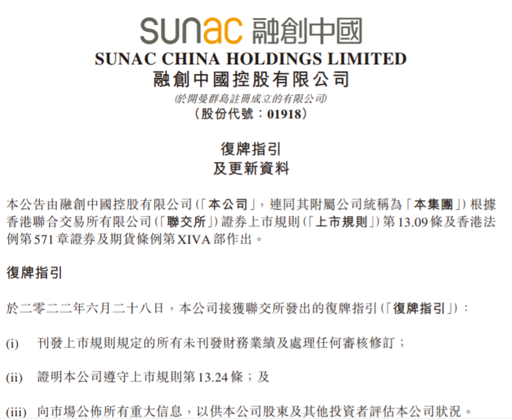 大公房产讯 7月4日,融创中国发布关于复牌指引及更新资料的公告。公告称,公司于2022年6月28日接获联交所发出的复牌指引,公司正采取适当措施以符合复牌指引及相关上市规则,并将适时刊发进一步的公告。