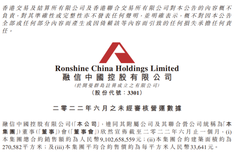 公告显示,融信中国连同其附属公司、其联合营公司2022年6月单月总合约销售额约为91.03亿元,同比下降约38.67%;合约建筑面积约为27.06万平方米,同比下降约62.11%;平均合约售价约为每平方米3.36万元。