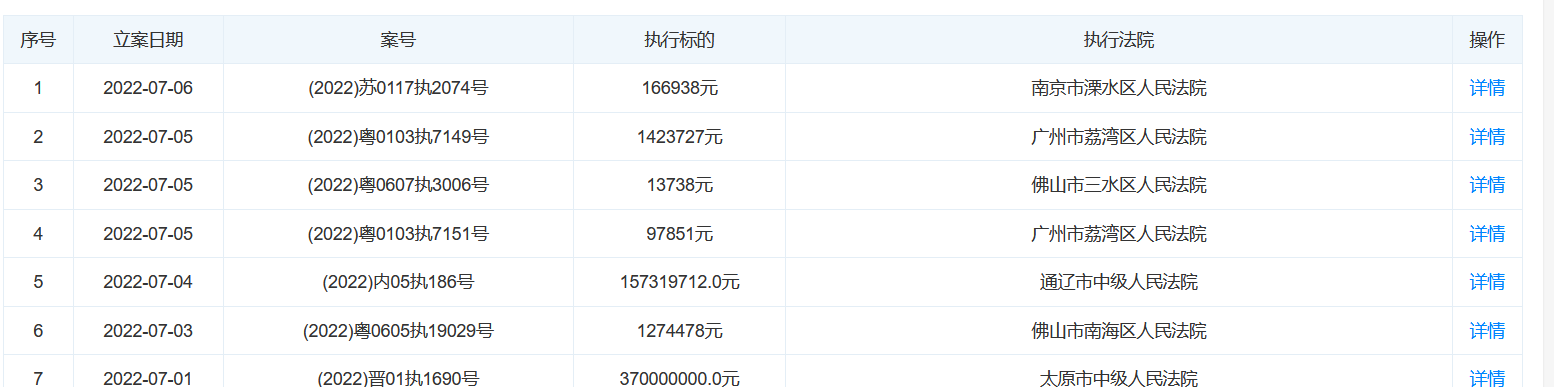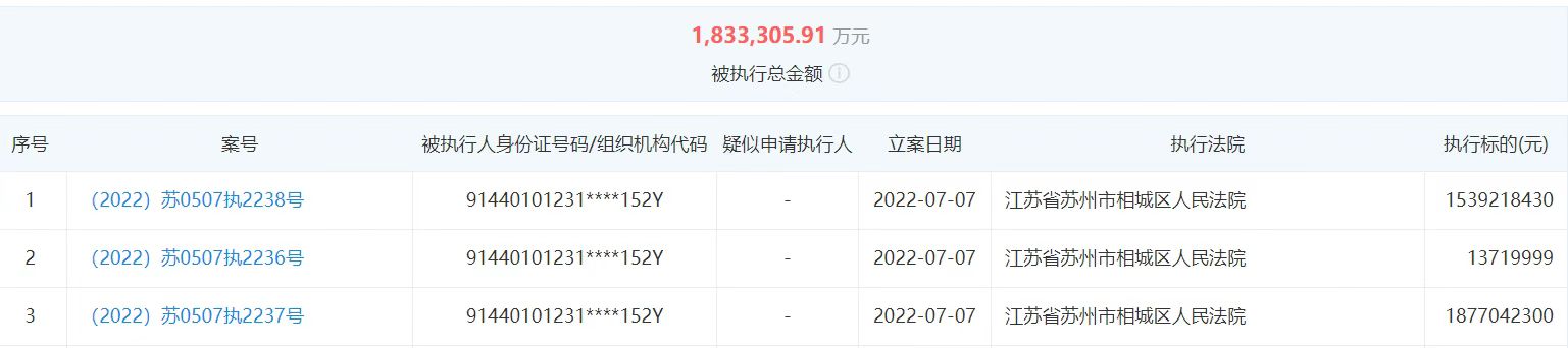 据悉,被执行案号分别为(2022)苏0507执2236号、(2022)苏0507执2237号、(2022)苏0507执2238号执行标的分别为0.137亿元、18.77亿元、15.39亿元,执行法院均为苏州市相城区人民法院。