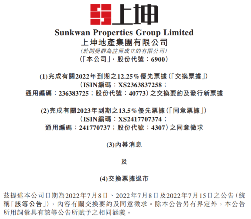 大公房产讯 7月19日,上坤地产发布公告称,于7月18日,交换要约的所有先决条件已获达成,公司已完成交换要约。