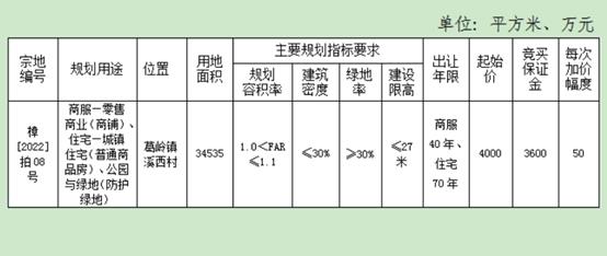 据悉,该地块位于永泰县葛岭镇溪西村,用地总面积34535平方米,其中计容建设用地32878平方米,防护绿地用地面积1657平方米;配建商业计容建筑面积不大于3000平方米。沿地块西侧无偿配建1657平方米防护绿地,并负责日常管护,计入配套成本。