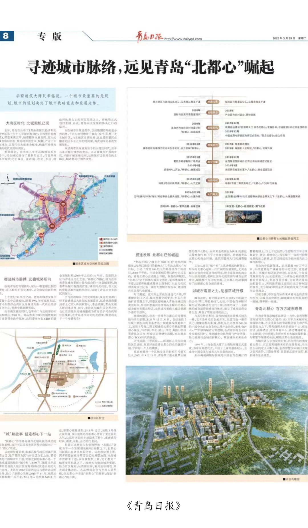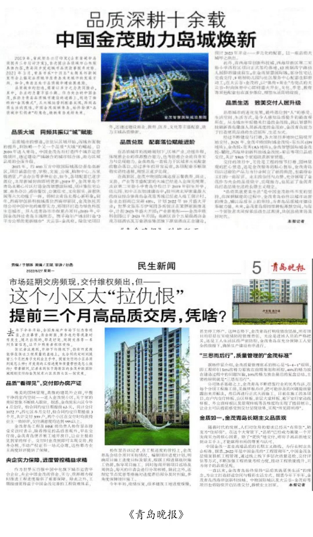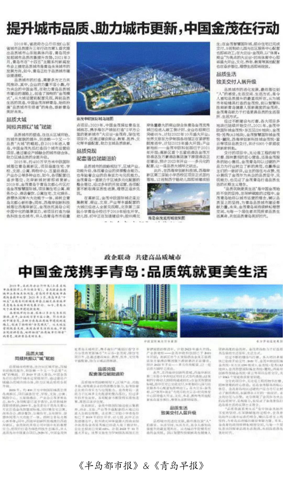 深耕青岛十余载,金茂青岛在城市运营方面取得的成果,不断受到官方媒体的高度认可。2022年上半年,《青岛日报》、《半岛都市报》、《齐鲁晚报》、《青岛晚报》、《青岛早报》等官媒纷纷报道,针对金茂青岛助力品质城市建设、助推青岛绿色城市发展、赋能青岛城市更新等方面做专题解读,充分肯定金茂青岛为青岛迭代发展做出的卓越贡献。
