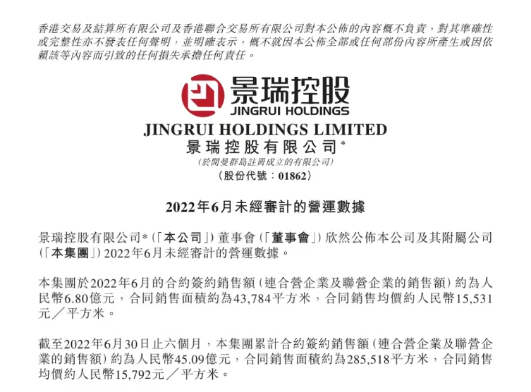 早在7月4日晚间,景瑞控股发布2022年6月未经审计的营运数据。