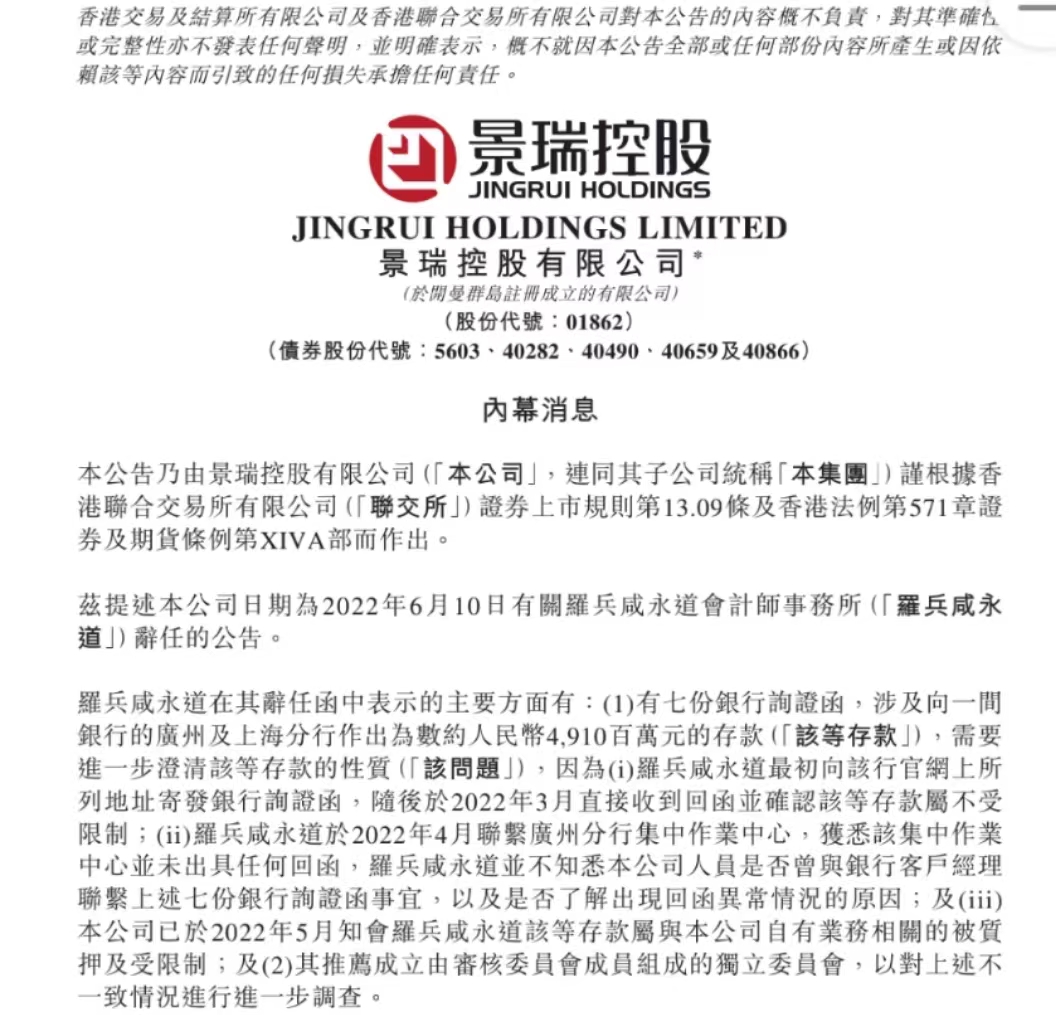 大公房产讯 7月21日,景瑞控股发布公告,披露罗兵咸永道在其辞任函中表示的主要内容。