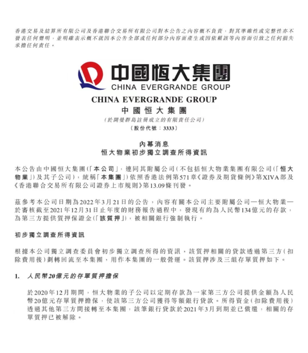 公告显示,此前恒大物业134亿元存款质押被相关银行强制执行事项有了初步调查结果。