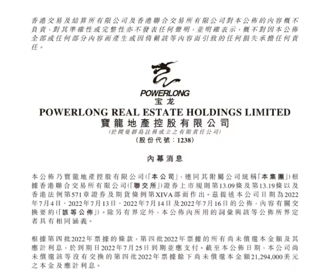 根据宝龙地产此前公告,作为第四批2022年票据的交换代价的一部分,宝龙地产已发行本金额为约1.7亿美元的2023年7月新票据,自2022年7月15日起按年利率4.0%计息,利息须分别于2023年1月15日及7月14日每半年支付一次,并于2023年7月14日到期。