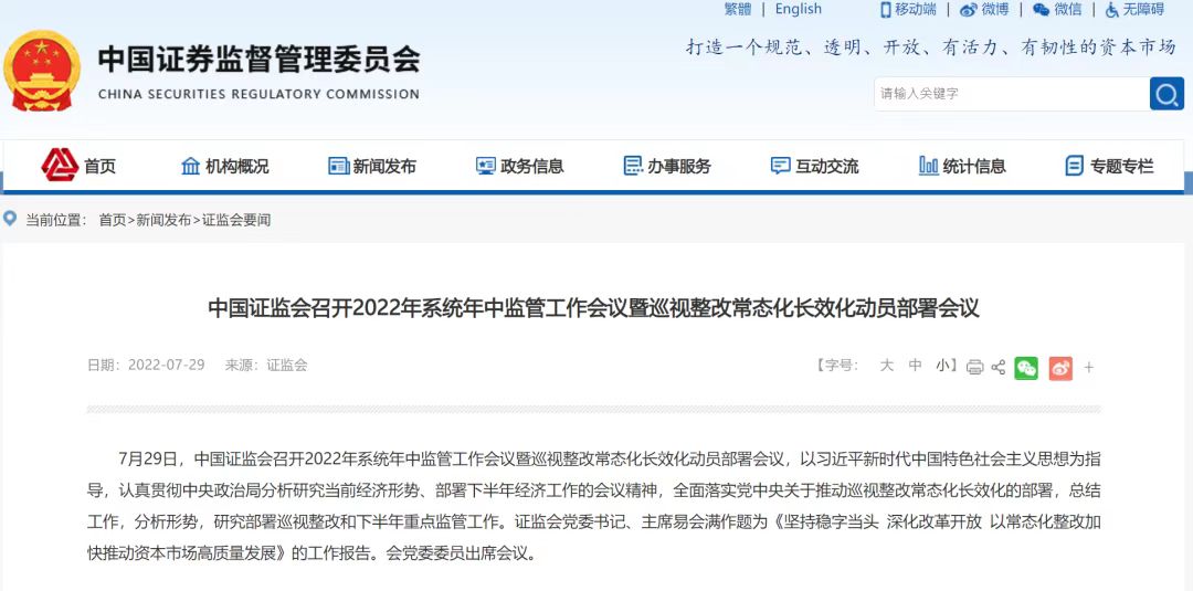 大公房产讯 7月29日,中国证监会召开2022年系统年中监管工作会议暨巡视整改常态化长效化动员部署会议,明确下半年证券监管工作重点任务。