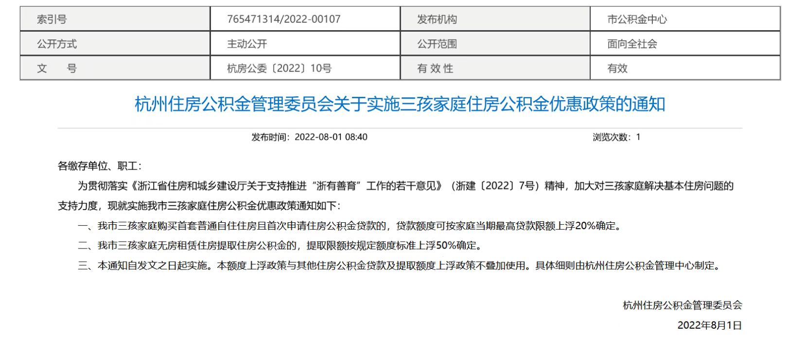 大公房产讯 8月1日,杭州住房公积金管理委员会发布关于实施三孩家庭住房公积金优惠政策的通知。