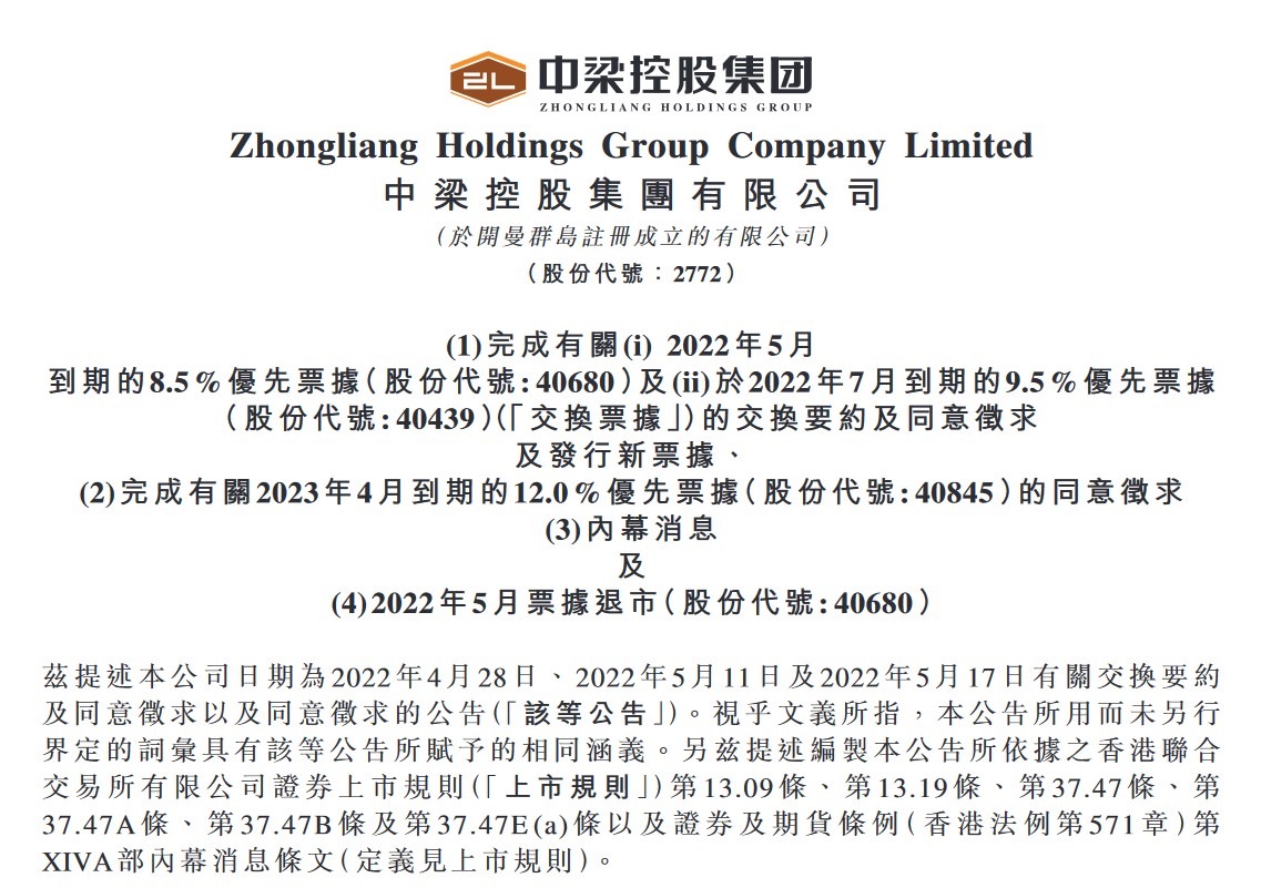 在6月1日,中梁控股再次宣布,拟对其2022年5月和2022年7月票据的剩余未偿余额进行交换要约。