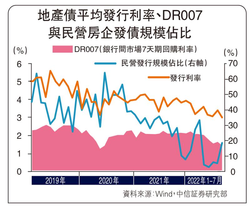 (1)资金宽松,2022年7月以来货币政策继续保持宽松,DR007(银行间市场7天期回购利率)在1.40%左右徘徊,资金利率下移明显,使地产债发行利率对应下降;