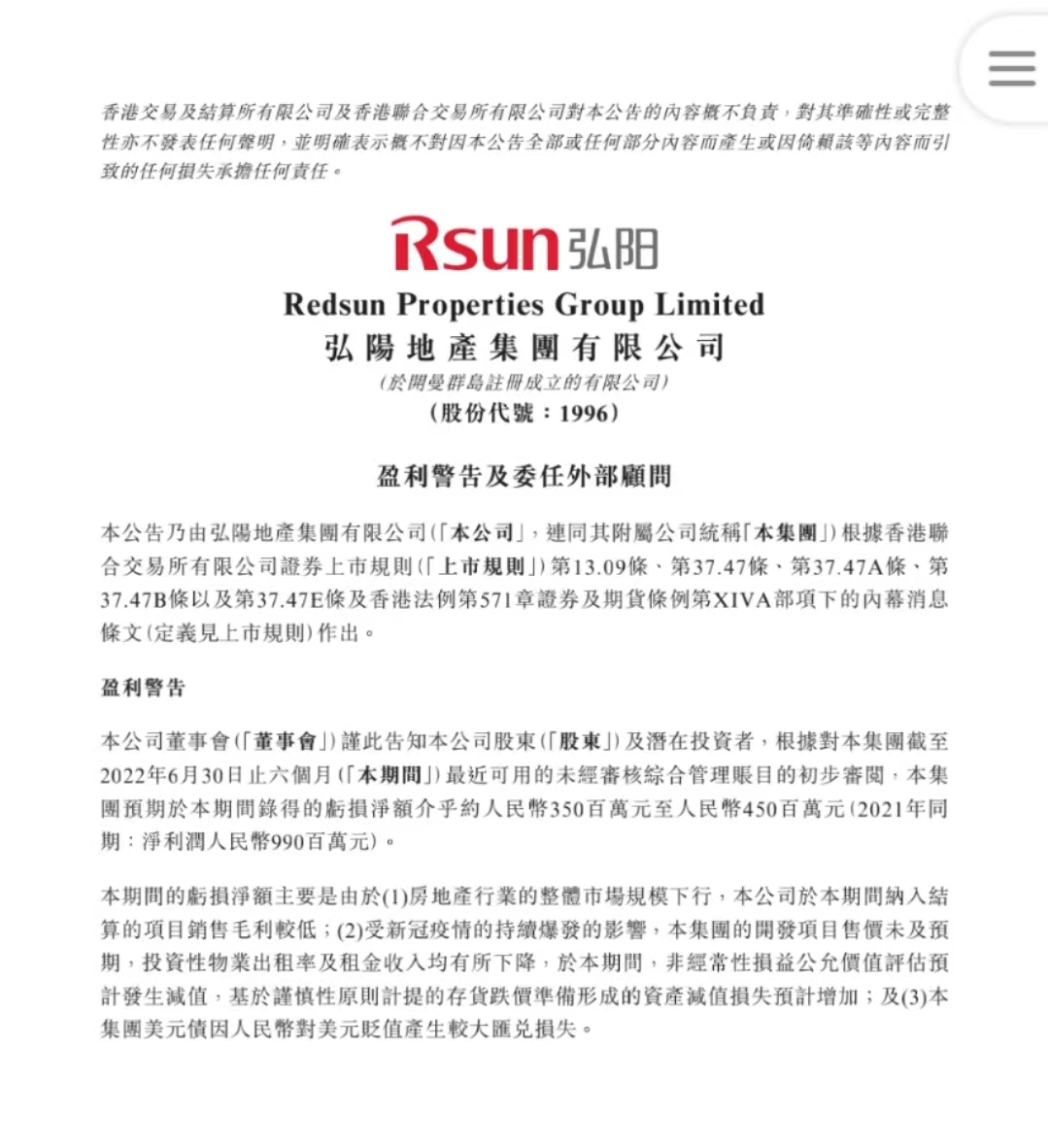 此外,受新冠疫情的持续爆发影响,弘阳地产开发项目售价未及预期,投资性物业出租率及租金收入有所下降;期内,非经常性损益公允价值评估预计发生减值,基于谨慎性原则计提的存货跌价准备形成的资产减值损失预计增加;同时,集团美元债因人民币对美元贬值产生较大汇兑损失。