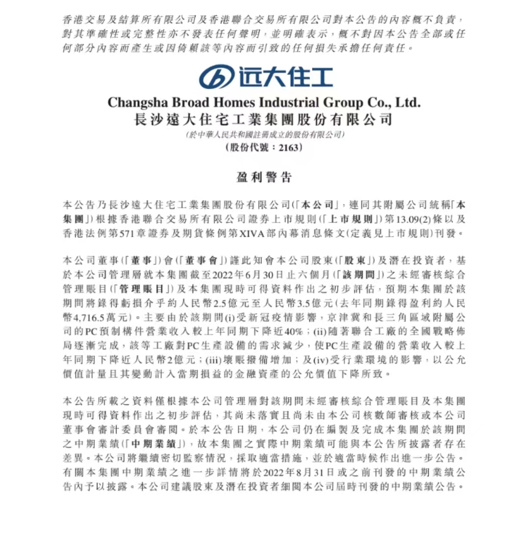 大公房产讯 8月12日,远大住工(02163.HK)发布盈利警告。