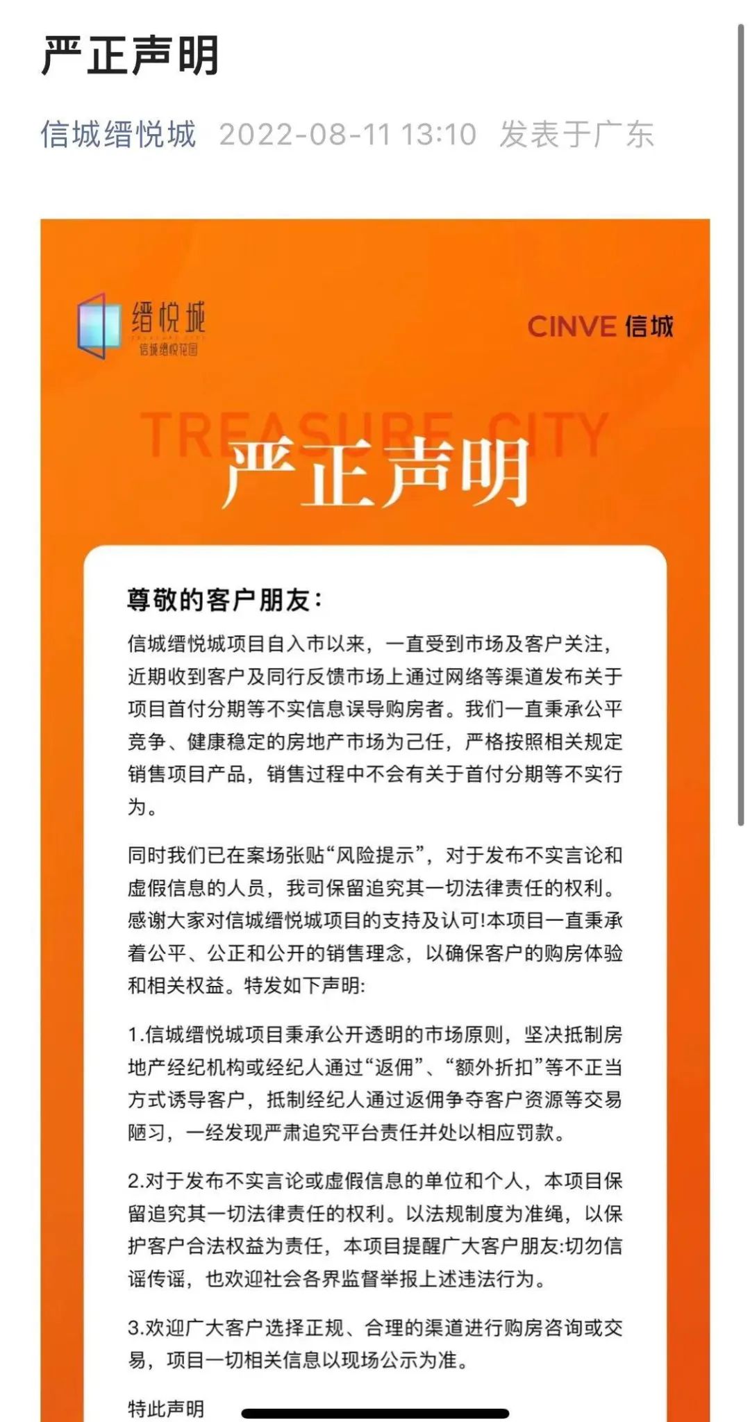 据深圳市住建局网站信息显示,信城缙悦城目前1-4栋的“期房待售”房源均显示“分局锁定”。值得注意的是,信城缙悦城项目开发企业深圳市深润川实业有限公司随后发布声明称,“近期收到客户及同行反馈市场上通过网络等渠道发布关于项目首付分期等不实信息误导购房者。我们一直秉承公平竞争、健康稳定的房地产市场为己任,严格按照相关规定销售项目产品,销售过程中不会有关于首付分期等不实行为。”