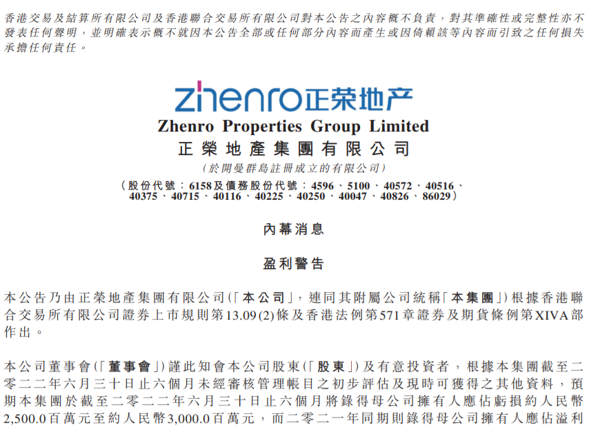 截至2022年6月30日,正荣地产预期集团于上半年将录得母公司拥有人应占亏损约25亿元至约30亿元,而2021同期则录得应占溢利11.66亿元。