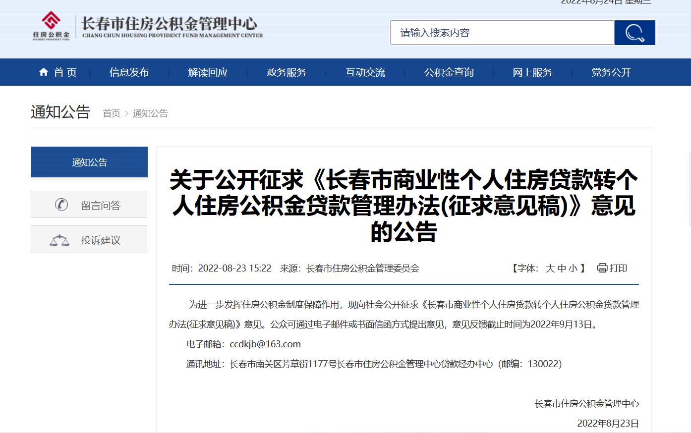 大公房产讯 8月23日,为进一步发挥住房公积金制度保障作用,减轻缴存职工家庭购买自住住房贷款的偿还压力,根据《住房公积金管理条例》和《长春市个人住房公积金贷款管理办法》等有关规定,长春市住房公积金管理委员会发布《长春市商业性个人住房贷款转个人住房公积金贷款管理办法(征求意见稿)》。办法适用于长春市商业性个人住房贷款(以下简称“商业贷款”)转个人住房公积金贷款(以下简称“公积金贷款”)的管理。