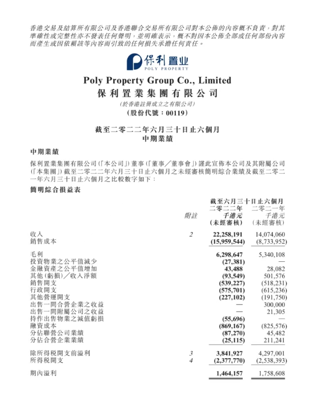 大公房产讯 8月24日,保利置业发布2022年半年度报告。