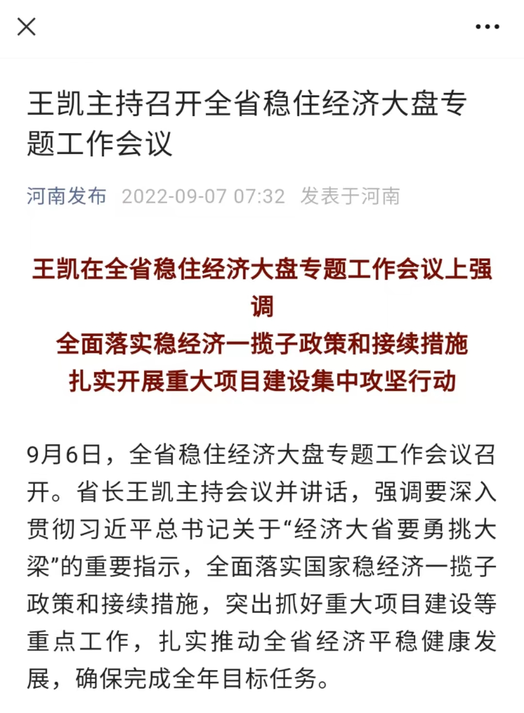 大公房产讯 据“河南发布”官方微信消息,9月6日,河南省稳住经济大盘专题工作会议召开,省长王凯主持会议并讲话。