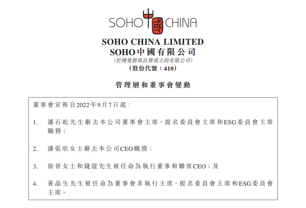 大公房产讯 9月7日,SOHO中国发布关于公司管理层和董事会变动的公告。