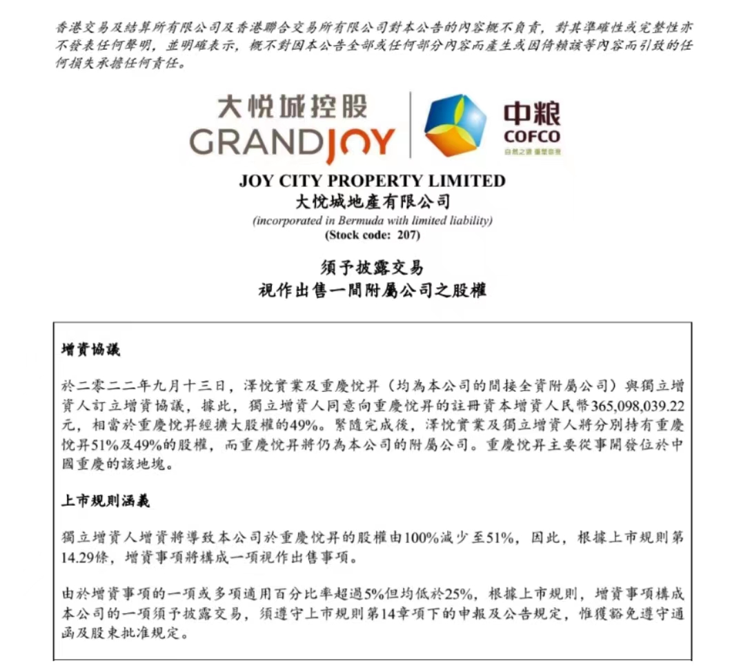 公告显示,于9月13日,大悦城地产间接全资附属公司泽悦实业及重庆悦升与独立增资人订立增资协议,独立增资人同意向重庆悦升的注册资本增资约3.65亿元,相当于重庆悦升经扩大股权的49%。