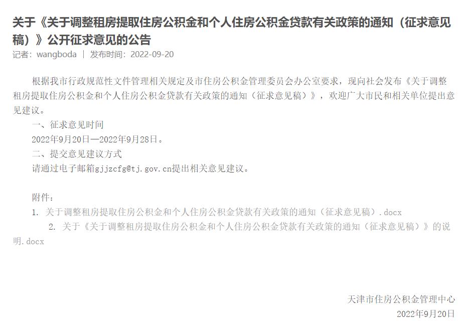 大公房产讯 9月20日,天津市住房公积金管理中心发布“关于《关于调整租房提取住房公积金和个人住房公积金贷款有关政策的通知(征求意见稿)》公开征求意见的公告”。
