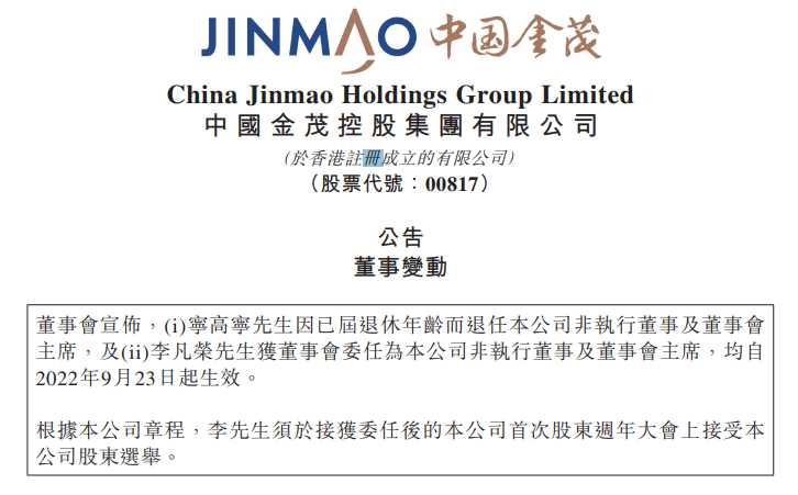 大公房产讯 9月23日晚间,中国金茂发布公告称,宁高宁因已届退休年龄而退任本公司非执行董事及董事会主席,同时,李凡荣获董事会委任为本公司非执行董事及董事会主席,均自2022年9月23日起生效。