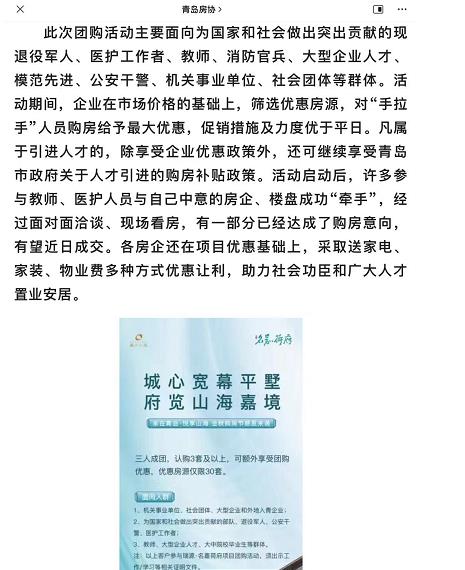 青岛房协表示,为了回馈疫情期间坚守岗位、无私奉献、默默付出的“最美逆行者”,赓续百年初心、担当育人使命的辛勤园丁,保家卫国的军人和公安干警及为国家和社会做出突出贡献的群体安家置业,市房协在全市范围内组织开展“手拉手”爱心购房团购项目系列活动。通过房企暖心助力,营造各行各业携手共建、积极应对的良好社会风气。