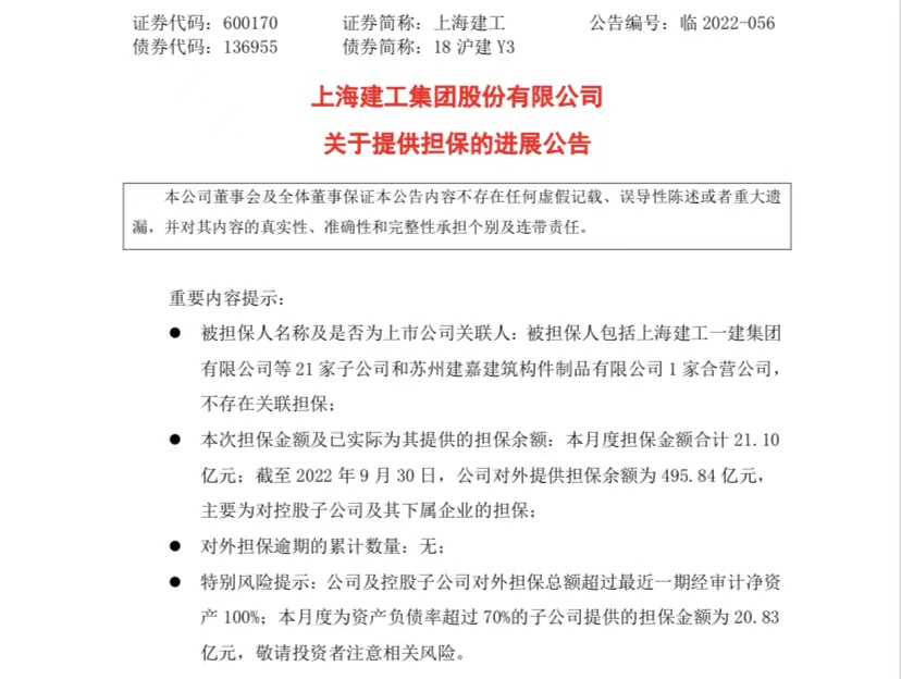 据了解,对资产负债率高于70%的18家子公司,上海建工集团提供的担保金额为20.83亿元;对资产负债率低于70%的3家子公司和1家合营公司,上海建工集团提供的担保金额为0.27亿元。