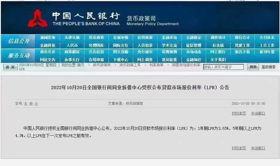 大公房产讯 10月20日,中国人民银行授权全国银行间同业拆借中心公布:1年期LPR为3.65%,5年期以上LPR为4.3%,均与上月持平。