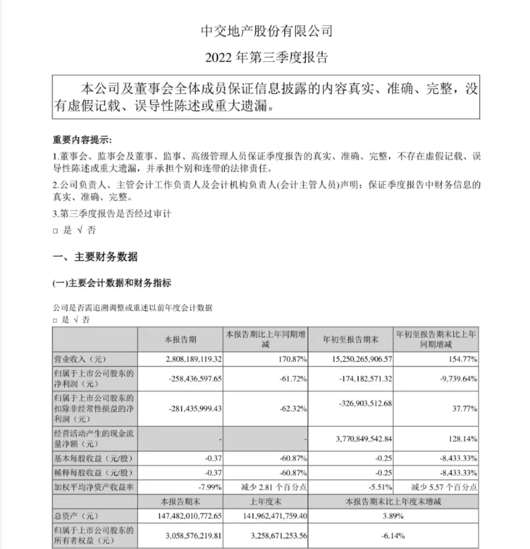 大公房产讯 10月31日,中交地产股份有限公司(以下简称“中交地产”)公布2022年第三季度业绩报告。