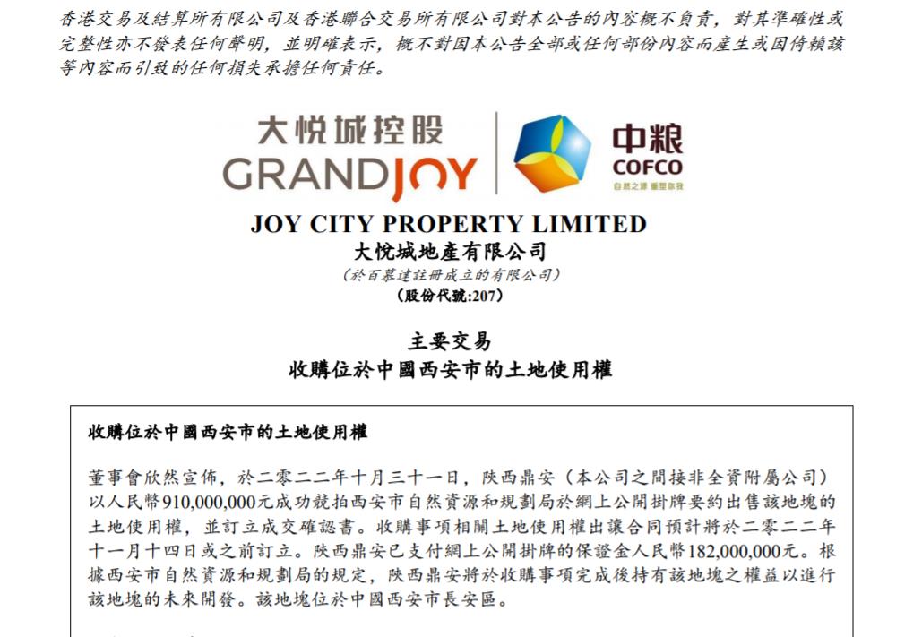 公告称,于2022年10月31日,陕西鼎安置业有限公司(下文简称“陕西鼎安”)以9.1亿元成功竞拍西安市自然资源和规划局于网上公开挂牌要约出售该地块的土地使用权,并订立成交确认书。