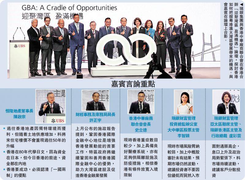 图:瑞银集团与香港中华厂商联合会在香港合办“迎聚湾区盈满机遇”论坛,探讨香港如何把握粤港澳大湾区发展带来的机遇。与会嘉宾在论坛上合影。