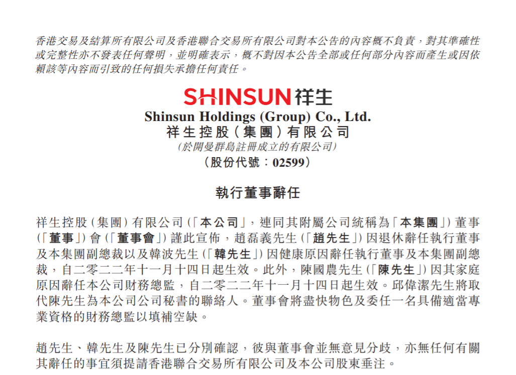11月14日,祥生控股集团发布关于公司执行董事辞任的公告。公告称,赵磊义因退休辞任执行董事及集团副总裁,韩波因健康原因辞任执行董事及集团副总裁,自11月14日起生效。