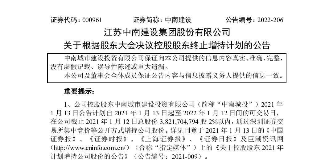 中南建设称,由于市场持续调整,行业良性循环还未恢复,中南城投预计 2023 年 1 月 12 日前没有能力完成增持计划,经公司 2022 年第五次临时股东大会同意,中南城投决定终止有关增持计划。