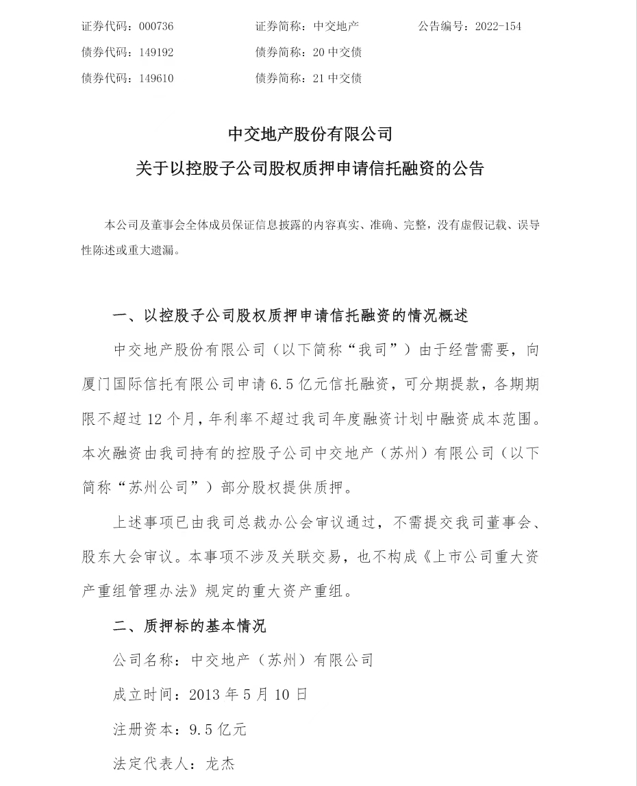 公告显示,中交地产由于经营需要,向厦门国际信托有限公司申请6.5亿元信托融资,可分期提款,各期期限不超过12个月,年利率不超过公司年度融资计划中融资成本范围。本次融资由公司持有的控股子公司中交地产(苏州)有限公司(以下简称“苏州公司”)部分股权提供质押。