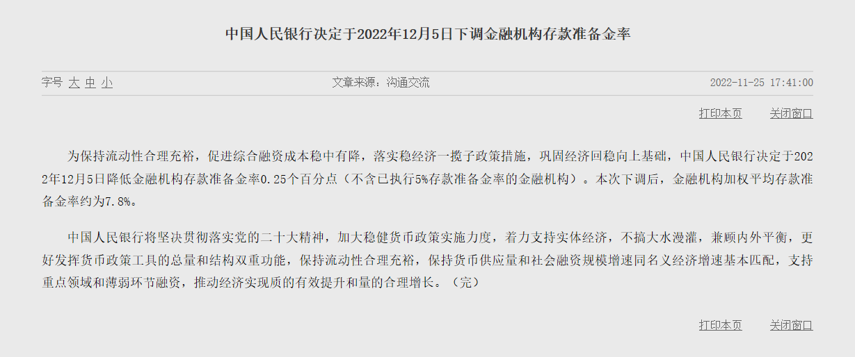 11月25日,中国人民银行官网显示,央行决定于2022年12月5日下调金融机构存款准备金率。文件称,为保持流动性合理充裕,促进综合融资成本稳中有降,落实稳经济一揽子政策措施,巩固经济回稳向上基础,中国人民银行决定于2022年12月5日降低金融机构存款准备金率0.25个百分点(不含已执行5%存款准备金率的金融机构)。本次下调后,金融机构加权平均存款准备金率约为7.8%。