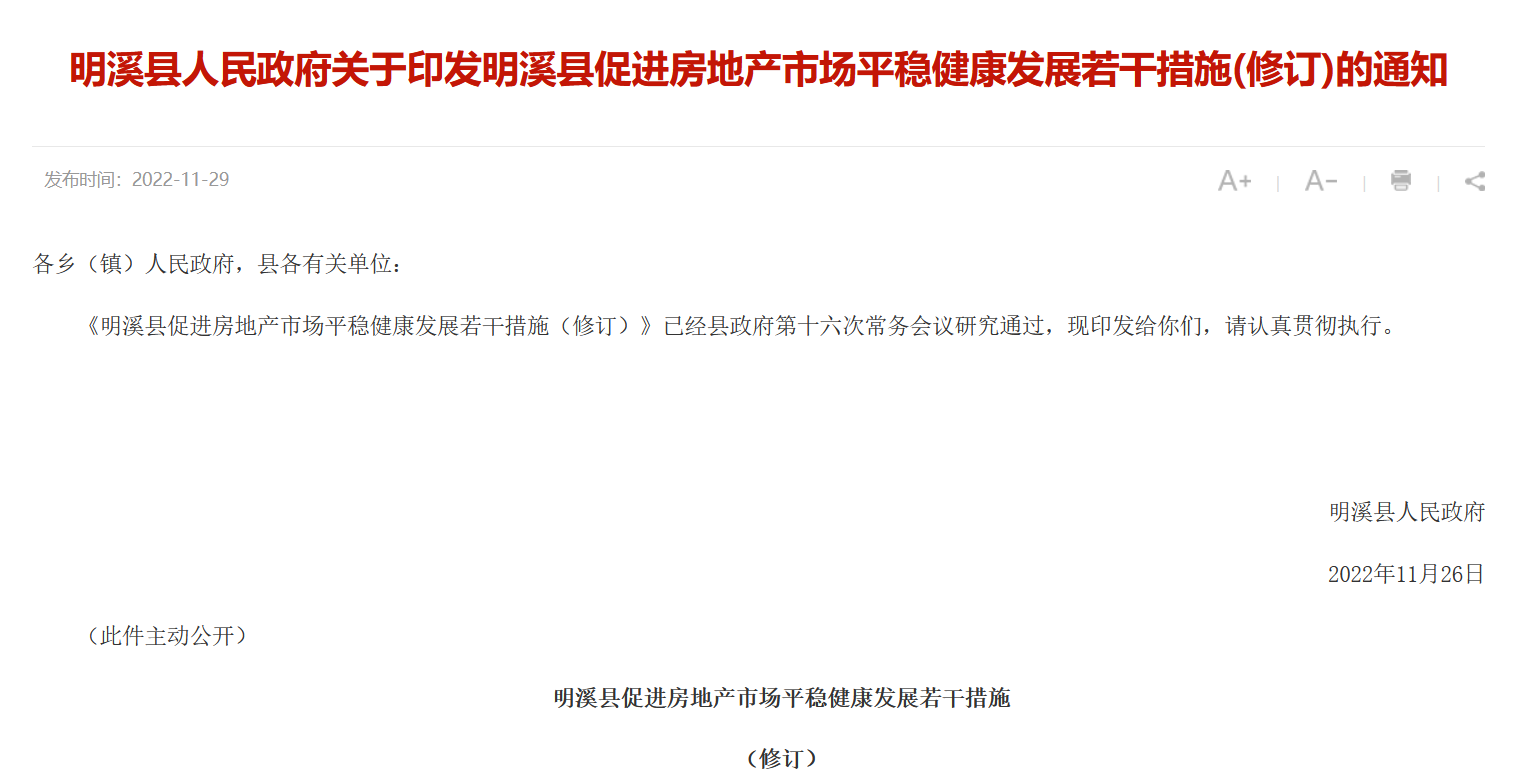 大公房产讯 11月29日,福建省三明市明溪县公布《明溪县促进房地产市场平稳健康发展若干措施(修订)》(以下简称“《措施》”),为吸引人才、鼓励农村人口进城购房,带动房地产市场健康发展发布关于住房补贴、购房优惠等举措。