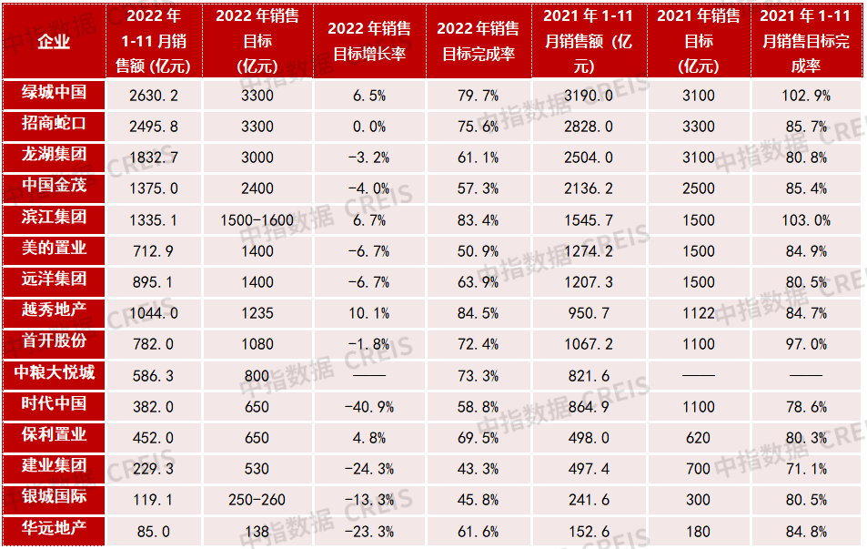 从公布销售目标的15家房地产企业来看,2022年1-11月,目标完成率均值为65.4%,低于去年同期的85.7%。对此,中指院认为,房企完成全年目标压力较大。