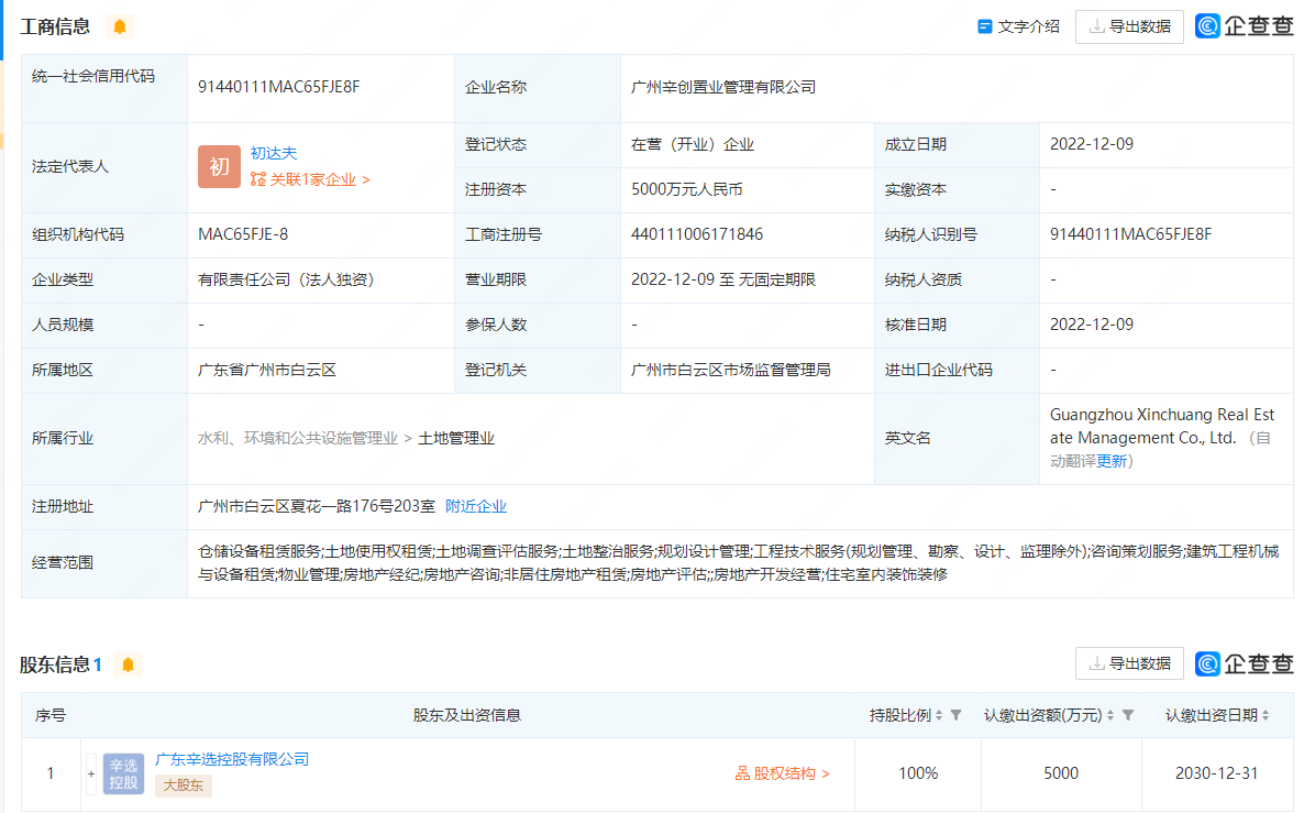 企查查显示,近日,广东辛选控股有限公司(下文简称“辛选控股”)投资5000万元成立了广州辛创置业管理有限公司,该公司法人为初达夫,经营范围包含仓储设备租赁服务、房地产开发经营、房地产经纪、房地产咨询等。